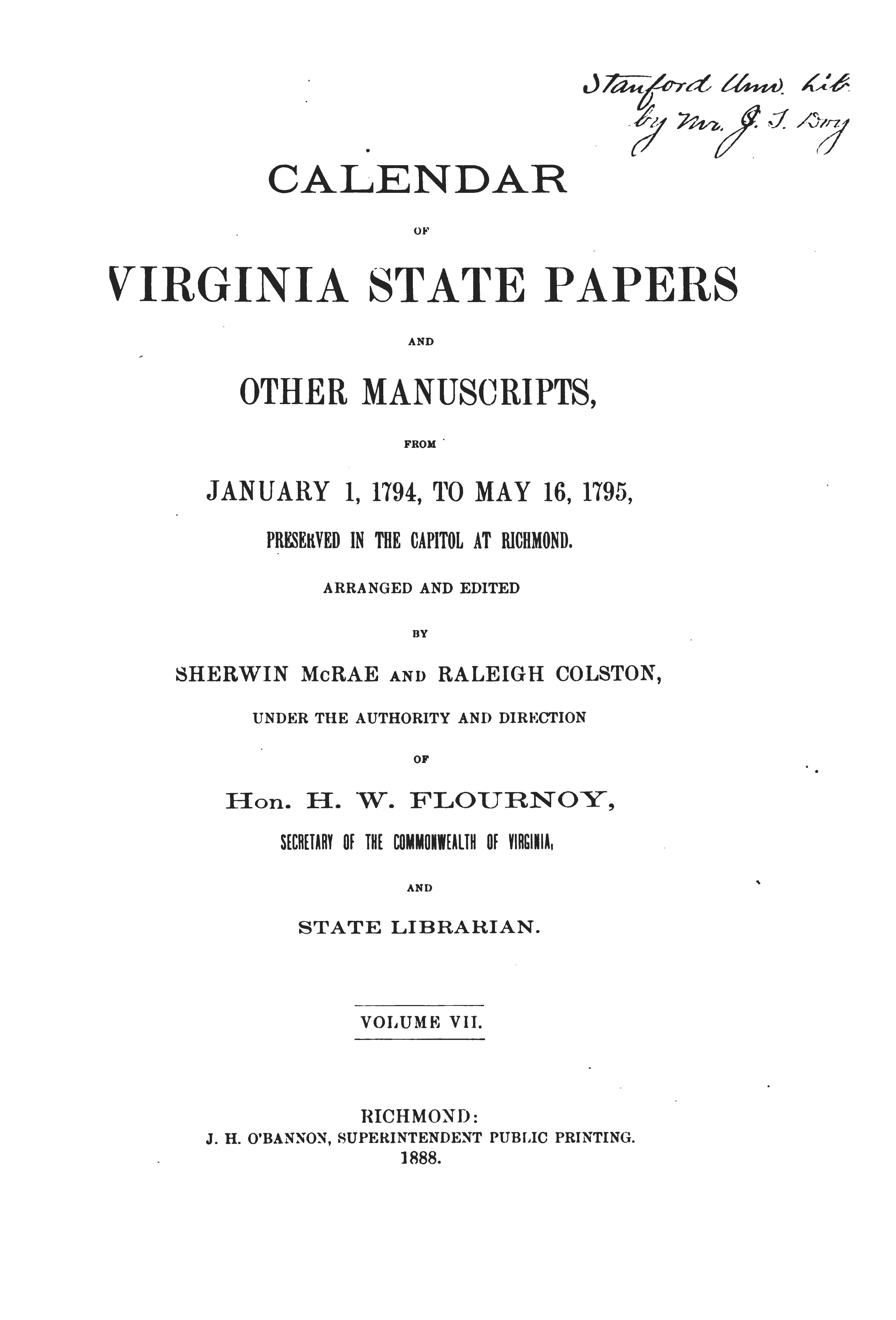 777 KB | Gwsweeney (talk | contribs) | Title page of the ''Calendar of Virginia State Papers and Other Manuscripts, 1652-1869,'' vol. 7, Sherwin McRae and Raleigh Colston, eds. (Richmond: J.H. O'Bannon, 1888). Category: Title Pages | 1 |